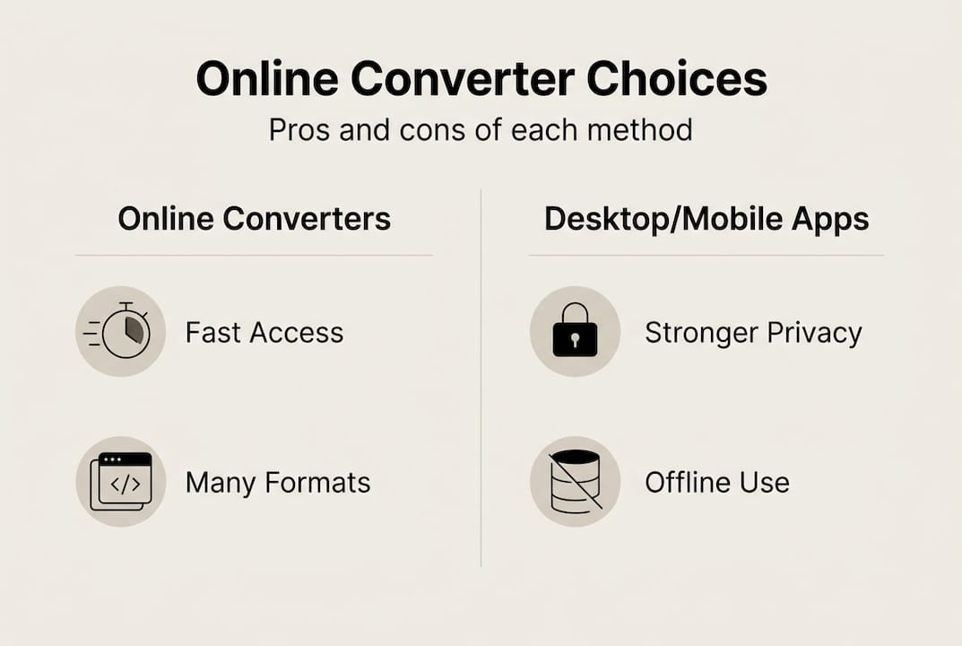 Online converters offer ease of use and accessibility, while desktop apps often provide stronger security and offline capabilities. Understanding these trade-offs helps you select the right tool for each situation you encounter.